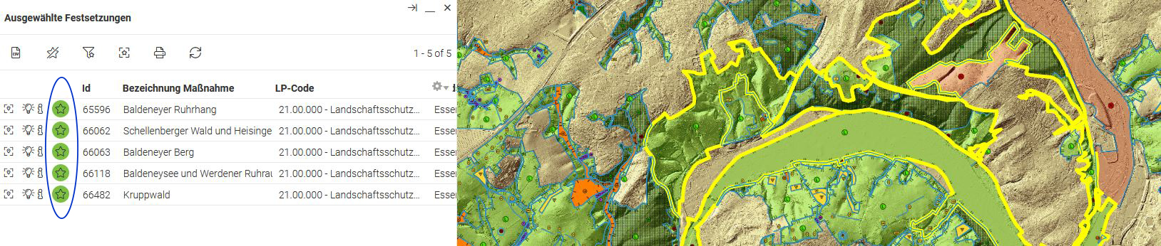 Sind Elemente mit dem Werkzeug in der Tabelle über die Detailansicht oder über das Selektieren in der Karte ausgewählt, erscheint im Kopfbereich der Anwendung neben dem Tabellen-Icon ein weiteres Tabellen-Icon mit einem Stern in der unteren Ecke ,das die Tabelle mit den selektierten Elementen aufruft.