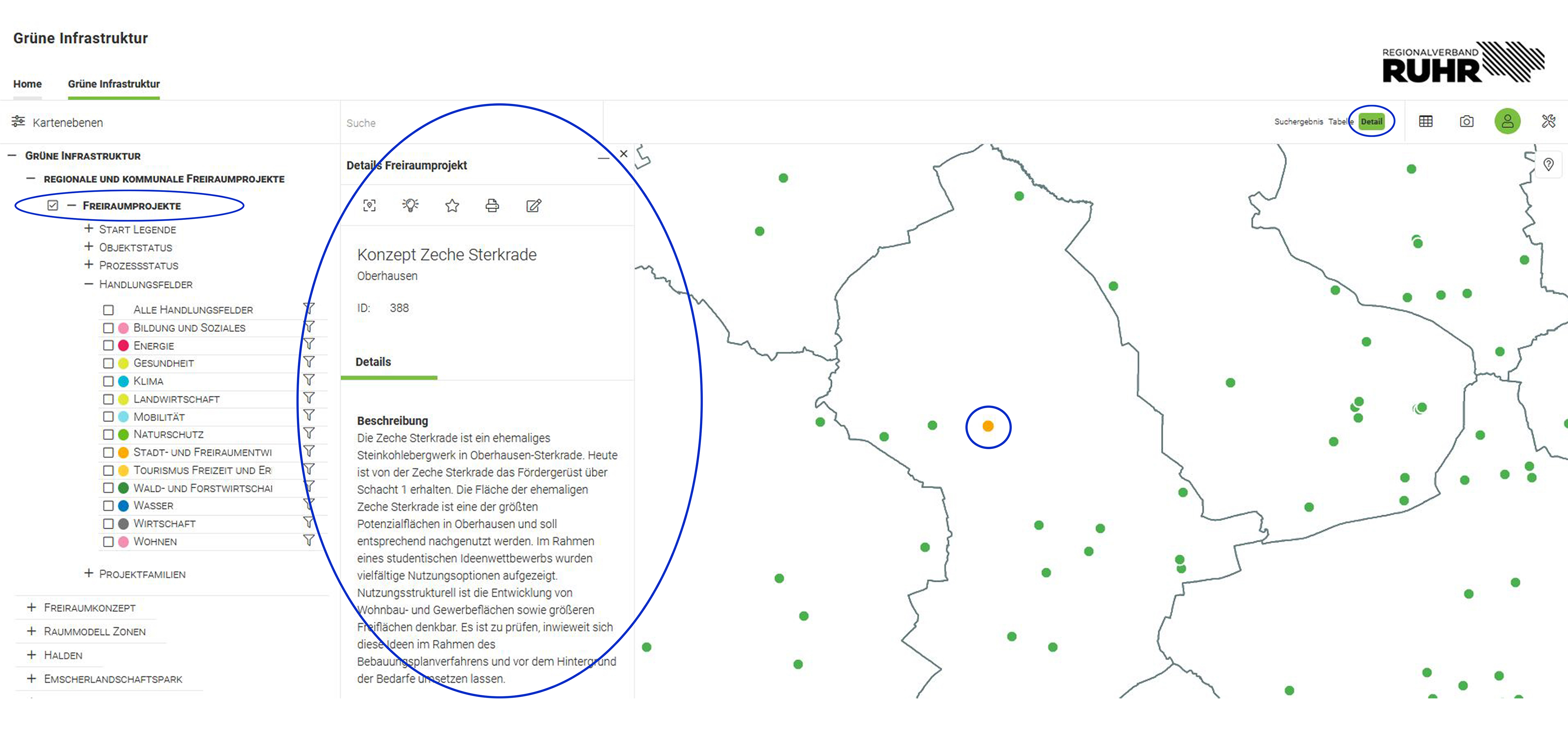 In der Anwendung ist immer nur ein Layer aktiv und nur zu diesem können Informationen wie Details oder die Tabelle aufgerufen werden. Wie im Kapitel Layerebenen beschrieben, wird ein Layer durch Klick auf den Schriftzug des Layernamens im Layerbaum aktiv geschaltet. Sichtbares Zeichen ist die Anzeige des Layernamens in Fettschrift.