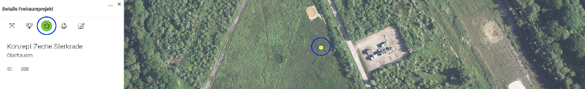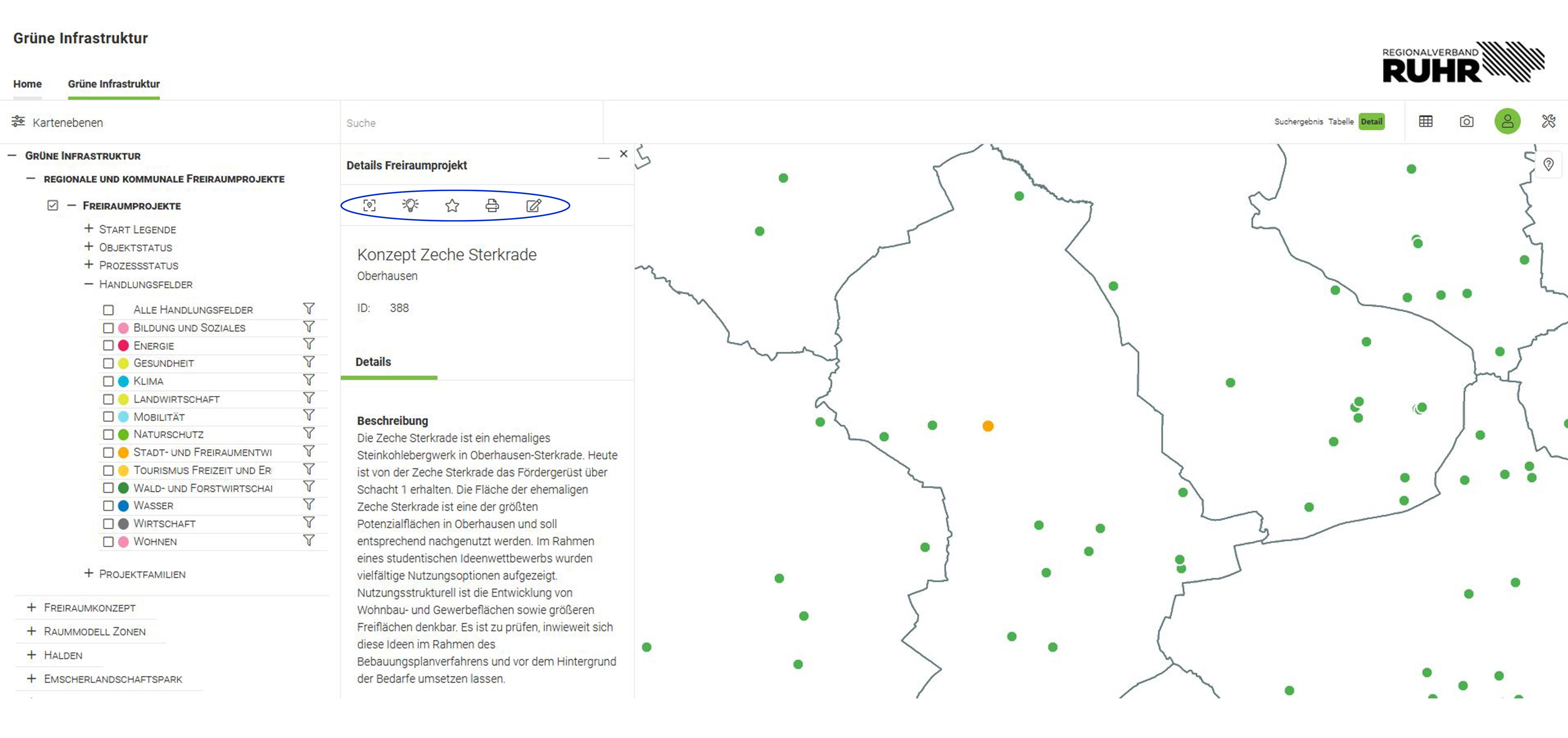 Ein Klick auf das Icon  zoomt die Karte zum Element. Bei Berühren/Überfahren mit der Maus (‚mouseover‘) über das Icon   hebt das Element in der Karte hervor. Das Icon  selektiert das Element für weitere Aktionen (wie z.B. Seriendruck, Tabellenexport oder räumliche Analysen). Ist ein Element selektiert, wird das durch einen farbig hinterlegten Stern angezeigt und das Element wird in der Karte Gelb dargestellt.